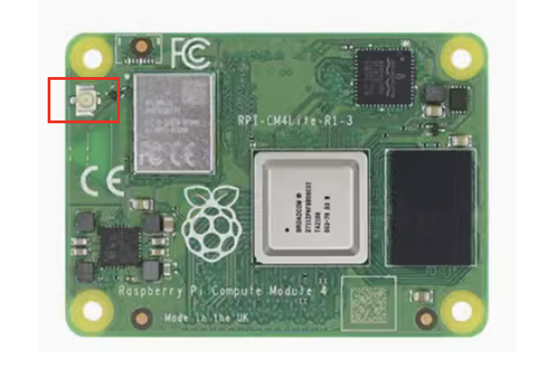 If your CM4 has Wi-Fi functionality, open the metal casing of v1 and attach the Wi-Fi antenna from the package to the IPX interface on the CM4, as shown by the red box in the diagram below; the installation location on the casing for the antenna is defined as position 11 in the interface layout diagram.