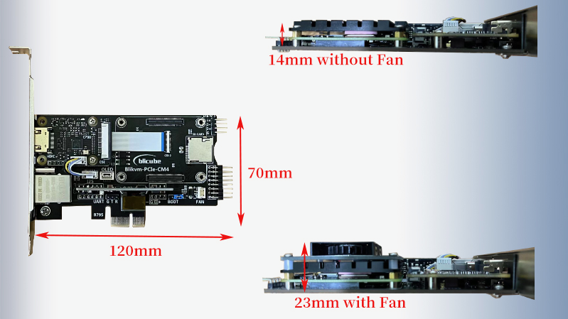 Use a cooling fan to cool the Raspberry Pi CM4, but installing a fan will make the product thicker than a standard PCIe add-in card.