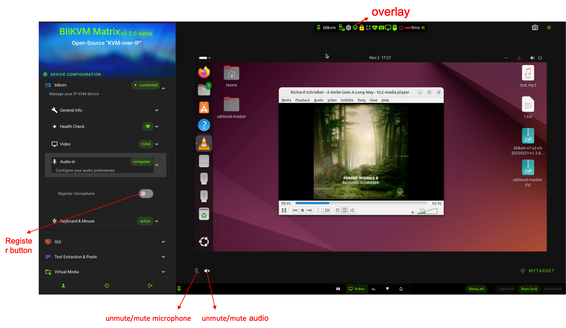 BliKVM v1/v2/v3 supports two‑way audio. This works a bit differently from typical software voice calls: on the web side, the audio is sent to the controlled PC via a USB microphone emulated by the KVM. Therefore, if you want the web user and the user at the controlled PC to talk directly, the controlled PC also needs to be configured accordingly.